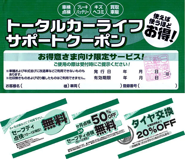 当店にて車検をご利用いただきましたお客様へ、次回車検時までの期間に使用できるクーポンをお渡ししております。